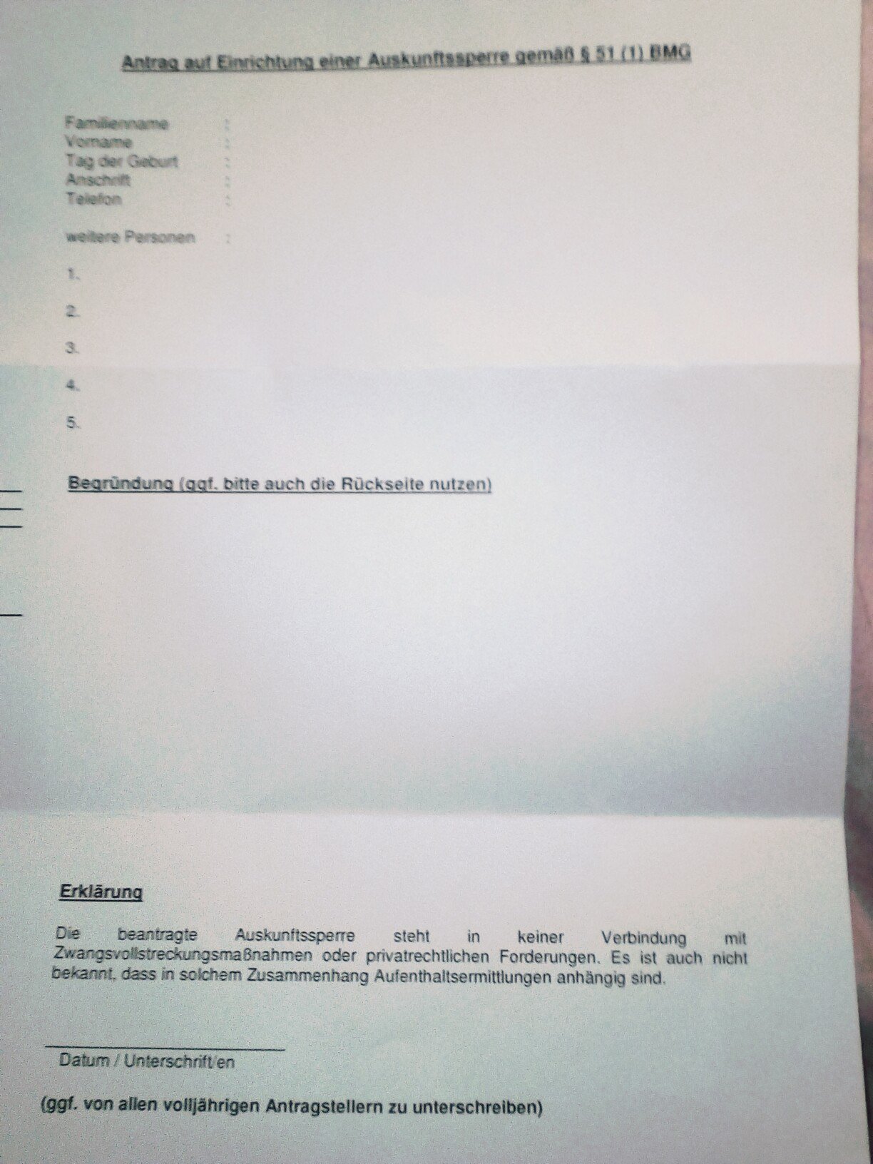 Bmg Deutschlandreform. Strafanzeigen, verfügungen nach dem gewaltenschutzgesetz usw.) erforderlich. Ergibt sich aus dieser überprüfung, dass die entsprechenden voraussetzungen vorliegen, so wird im melderegister eine auskunftssperre vermerkt, die sich auf alle arten der melderegisterauskunft an. Die auskunftssperre wird auf antrag eingetragen. Begründung der antragstellenden person liegen die gründe für einrichtung der auskunftssperre nach ablauf dieser frist weiterhin vor, kann die sperre auf antrag verlängert werden. Zur begründung wird auf nachstehenden. Vor einrichtung der auskunftssperre werden ihre angaben durch die meldebehörde überprüft. Ich beantrage eine auskunftssperre für auskünfte an antragstellerinnen und antragsteller von volksabstimmungen (z.b. Mit der antragsabgabe müssen sie tatsachen darlegen und glaubhaft machen, weshalb ihnen durch eine auskunftserteilung eine gefahr für leben, gesundheit, persönliche freiheit oder ähnliche schutzwürdige belange entstehen kann. Auskunftssperre, da durch eine melderegisterauskunft eine gefahr für leben. Anträge auf verlängerung einer auskunftssperre sind rechtzeitig zu stellen (möglichst zumindest zwei monate vor ablauf der auskunftssperre, siehe außerdem muss der antrag eine ausführliche begründung des schutzwürdigen interesses enthalten. Auskunftssperren, für die eine begründung erforderlich ist: Antrag auf auskunftssperre nach § 51 abs. Damit über ihren antrag auskunftssperre schnell entschieden werden kann, bitten wir sie folgendes zu beachten zur glaubhaftmachung des antrages ist eine ausführliche begründung und geeignete nachweise (z. Bitte erst lesen, bevor sie das formular ausfüllen! Auch bei anträgen auf verlängerung einer.