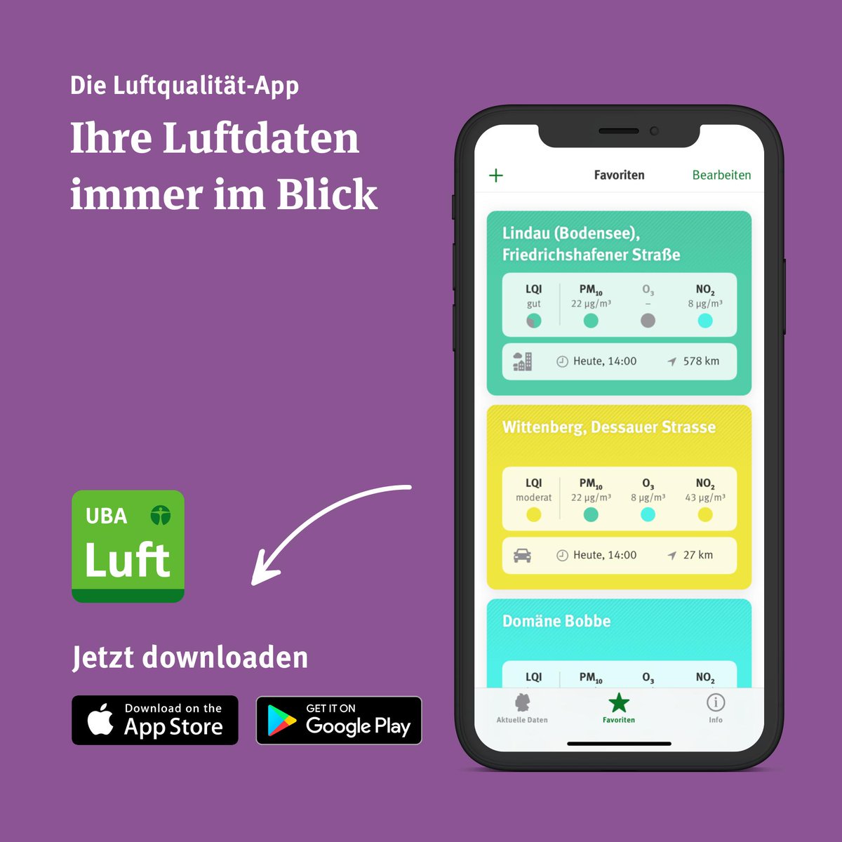 Diese app zeigt die luftqualität für mehr als 400 stationen in deutschland und gibt verhaltenstipps.